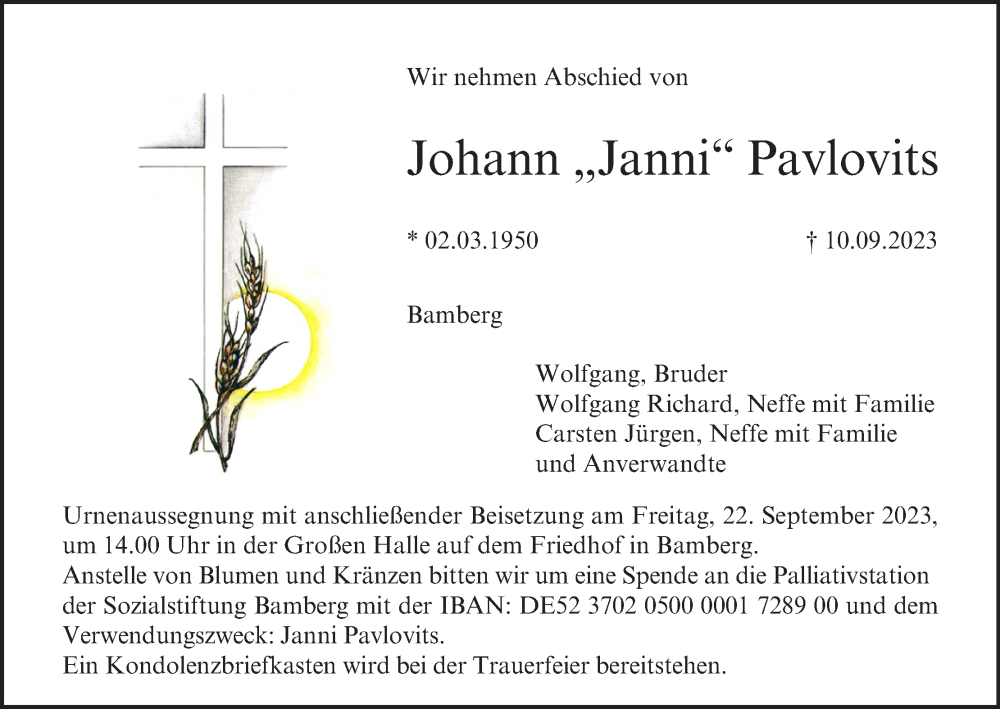 Hier finden Sie alle Traueranzeigen aus der Zeitung, die bisher für Johann Pavlovits erschienen sind. Weitere Traueranzeigen, die in der Zeitung erscheinen, werden hier ebenfalls aufgelistet