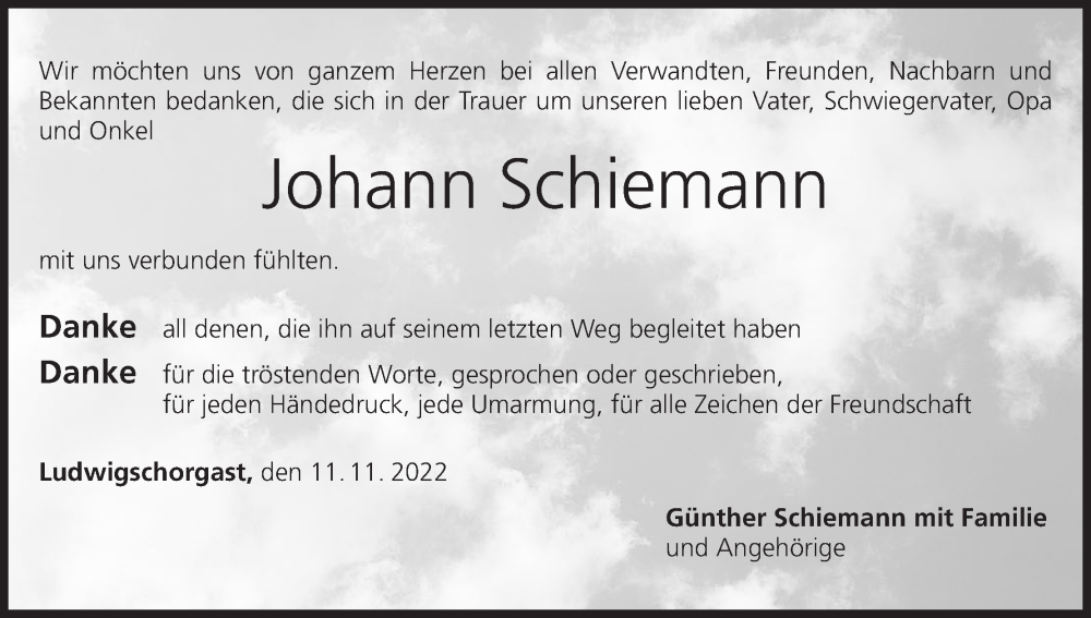 Hier finden Sie alle Traueranzeigen aus der Zeitung, die bisher für Johann Schiemann erschienen sind. Weitere Traueranzeigen, die in der Zeitung erscheinen, werden hier ebenfalls aufgelistet