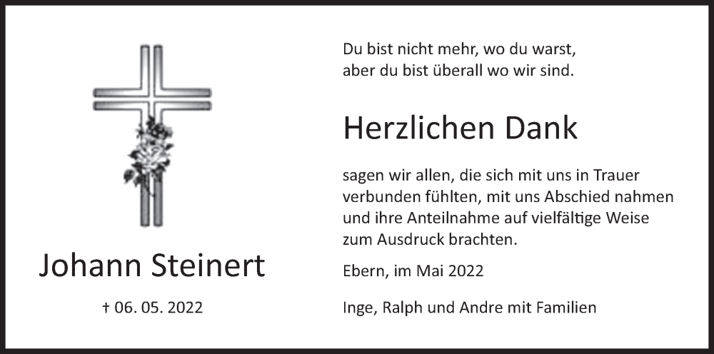 Hier finden Sie alle Traueranzeigen aus der Zeitung, die bisher für Johann Steinert erschienen sind. Weitere Traueranzeigen, die in der Zeitung erscheinen, werden hier ebenfalls aufgelistet
