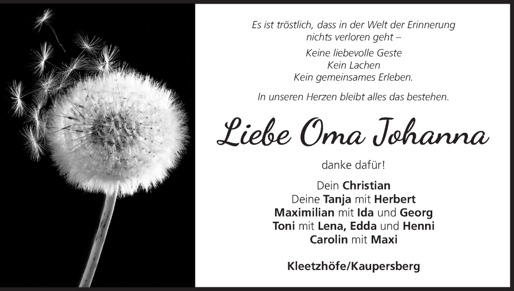 Hier finden Sie alle Traueranzeigen aus der Zeitung, die bisher für Johanna erschienen sind. Weitere Traueranzeigen, die in der Zeitung erscheinen, werden hier ebenfalls aufgelistet