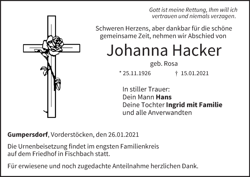 Hier finden Sie alle Traueranzeigen aus der Zeitung, die bisher für Johanna Hacker erschienen sind. Weitere Traueranzeigen, die in der Zeitung erscheinen, werden hier ebenfalls aufgelistet