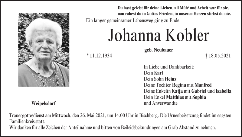 Hier finden Sie alle Traueranzeigen aus der Zeitung, die bisher für Johanna Kobler erschienen sind. Weitere Traueranzeigen, die in der Zeitung erscheinen, werden hier ebenfalls aufgelistet