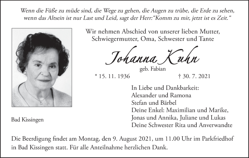 Hier finden Sie alle Traueranzeigen aus der Zeitung, die bisher für Johanna Kuhn erschienen sind. Weitere Traueranzeigen, die in der Zeitung erscheinen, werden hier ebenfalls aufgelistet