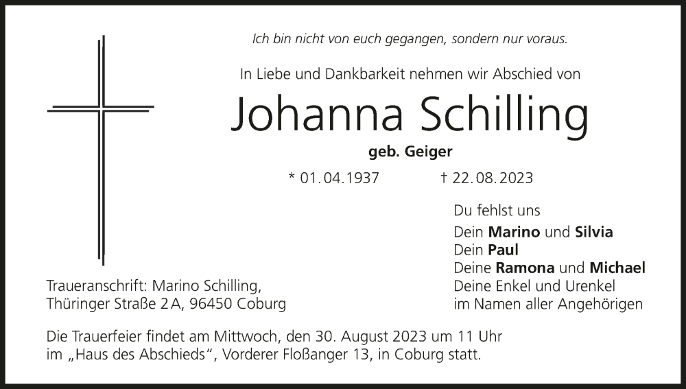 Hier finden Sie alle Traueranzeigen aus der Zeitung, die bisher für Johanna Schilling erschienen sind. Weitere Traueranzeigen, die in der Zeitung erscheinen, werden hier ebenfalls aufgelistet