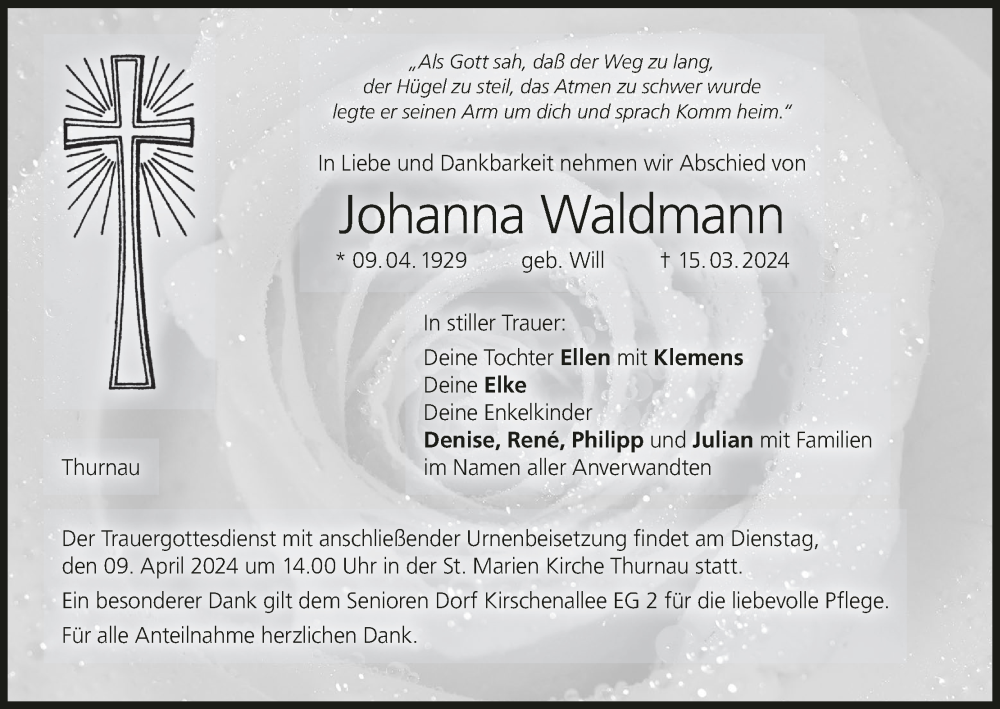 Hier finden Sie alle Traueranzeigen aus der Zeitung, die bisher für Johanna Waldmann erschienen sind. Weitere Traueranzeigen, die in der Zeitung erscheinen, werden hier ebenfalls aufgelistet