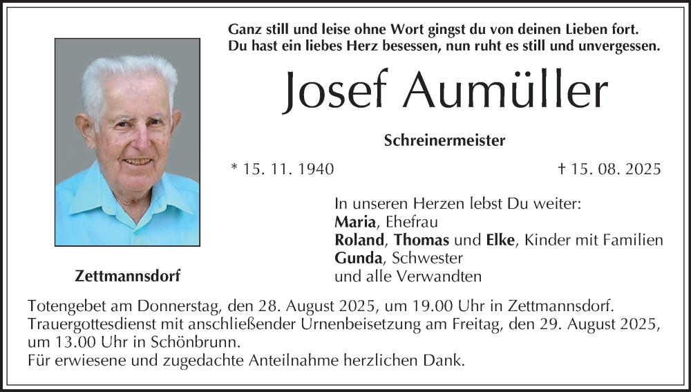 Hier finden Sie alle Traueranzeigen aus der Zeitung, die bisher für Josef Aumüller erschienen sind. Weitere Traueranzeigen, die in der Zeitung erscheinen, werden hier ebenfalls aufgelistet