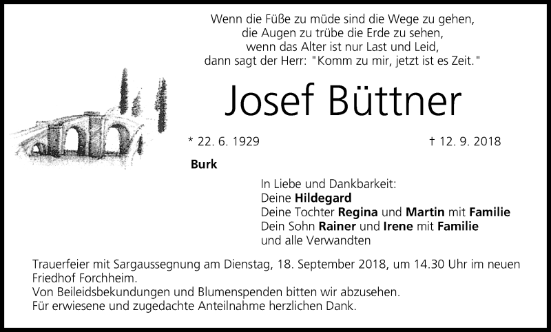 Hier finden Sie alle Traueranzeigen aus der Zeitung, die bisher für Josef Büttner erschienen sind. Weitere Traueranzeigen, die in der Zeitung erscheinen, werden hier ebenfalls aufgelistet