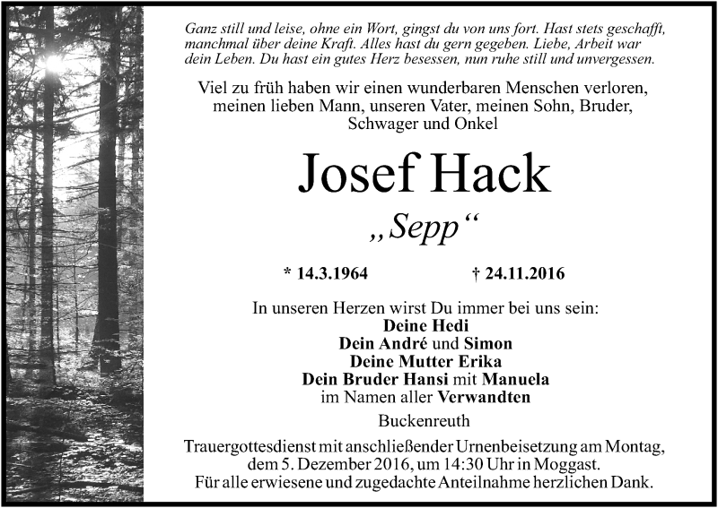 Hier finden Sie alle Traueranzeigen aus der Zeitung, die bisher für Josef Hack erschienen sind. Weitere Traueranzeigen, die in der Zeitung erscheinen, werden hier ebenfalls aufgelistet