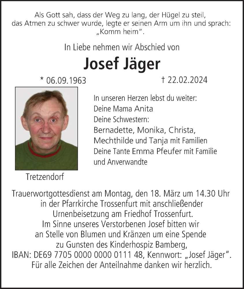 Hier finden Sie alle Traueranzeigen aus der Zeitung, die bisher für Josef Jäger erschienen sind. Weitere Traueranzeigen, die in der Zeitung erscheinen, werden hier ebenfalls aufgelistet