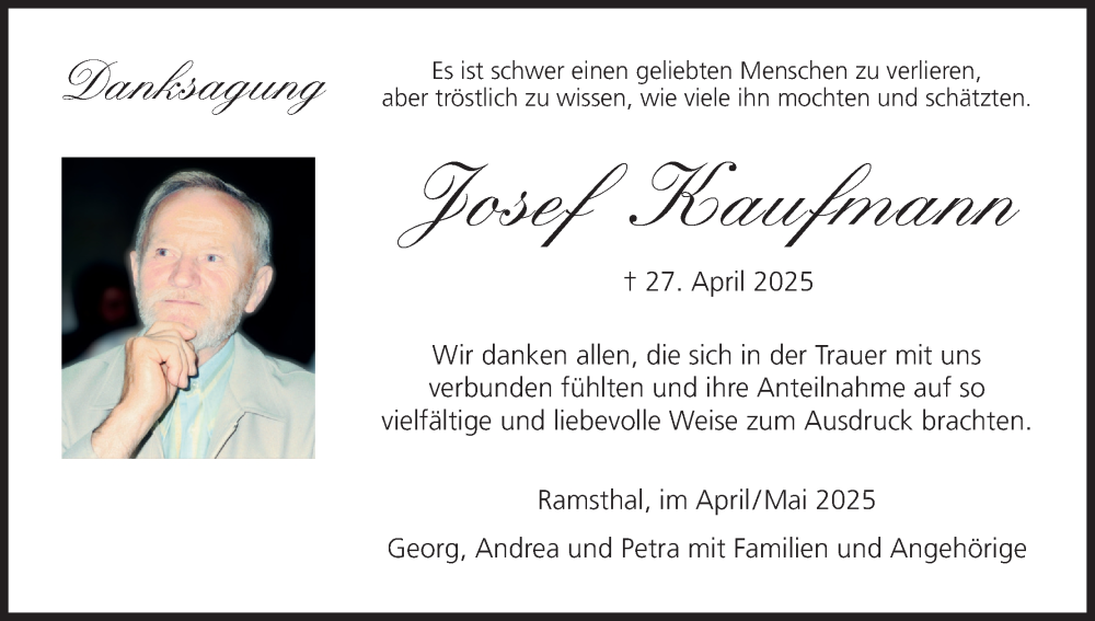 Hier finden Sie alle Traueranzeigen aus der Zeitung, die bisher für Josef Kaufmann erschienen sind. Weitere Traueranzeigen, die in der Zeitung erscheinen, werden hier ebenfalls aufgelistet