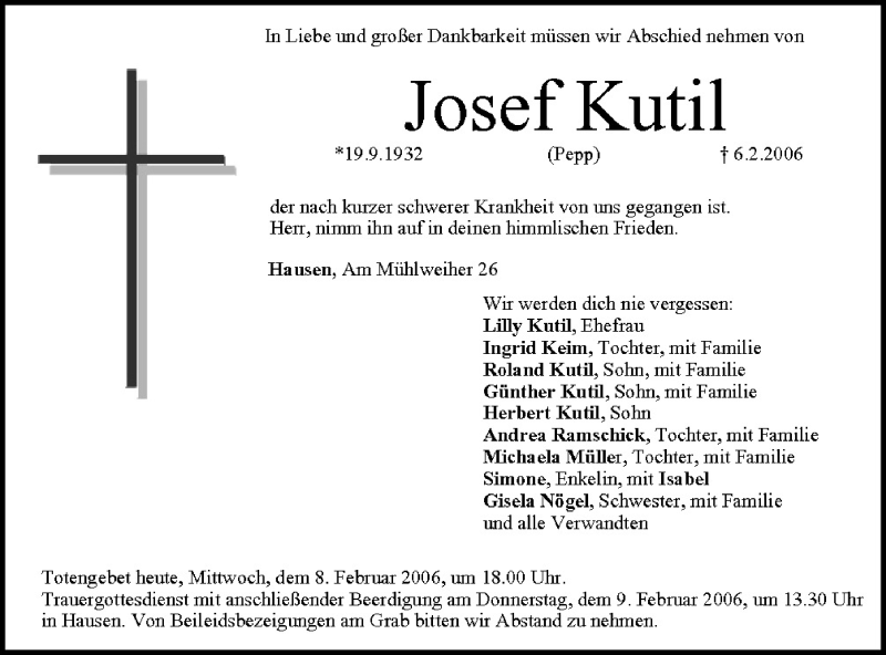 Hier finden Sie alle Traueranzeigen aus der Zeitung, die bisher für Josef Kutil erschienen sind. Weitere Traueranzeigen, die in der Zeitung erscheinen, werden hier ebenfalls aufgelistet