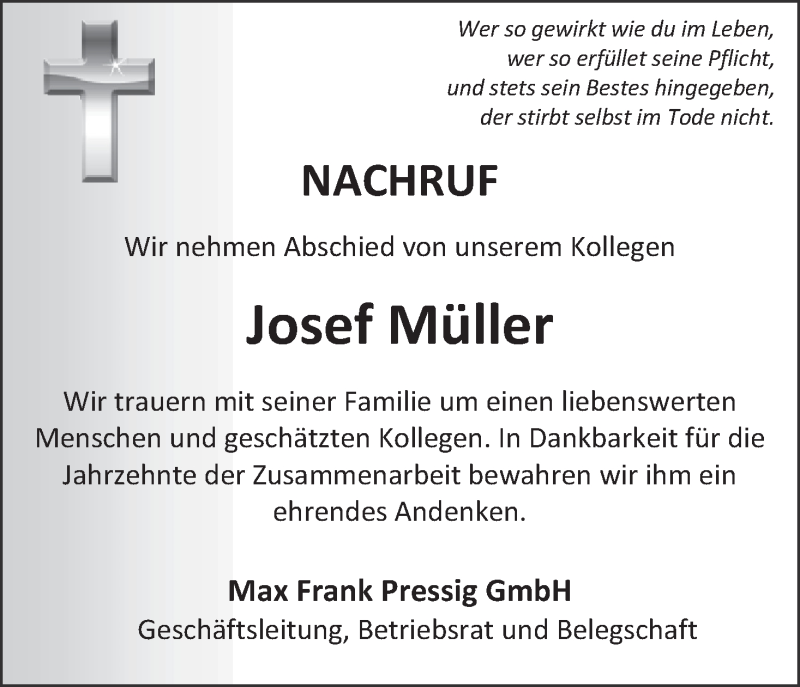 Hier finden Sie alle Traueranzeigen aus der Zeitung, die bisher für Josef Müller erschienen sind. Weitere Traueranzeigen, die in der Zeitung erscheinen, werden hier ebenfalls aufgelistet