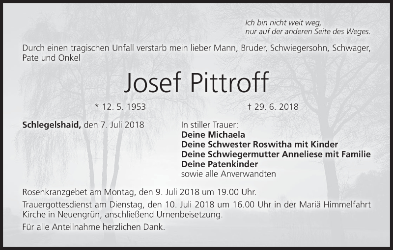 Hier finden Sie alle Traueranzeigen aus der Zeitung, die bisher für Josef Pittroff erschienen sind. Weitere Traueranzeigen, die in der Zeitung erscheinen, werden hier ebenfalls aufgelistet