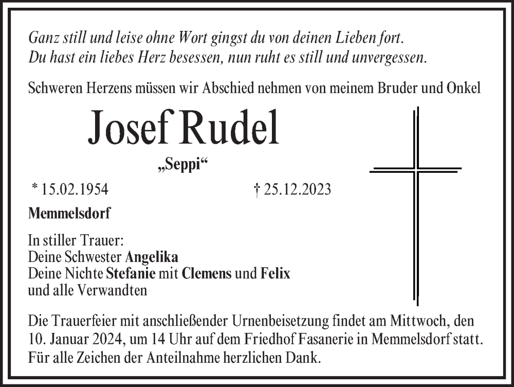 Hier finden Sie alle Traueranzeigen aus der Zeitung, die bisher für Josef Rudel erschienen sind. Weitere Traueranzeigen, die in der Zeitung erscheinen, werden hier ebenfalls aufgelistet
