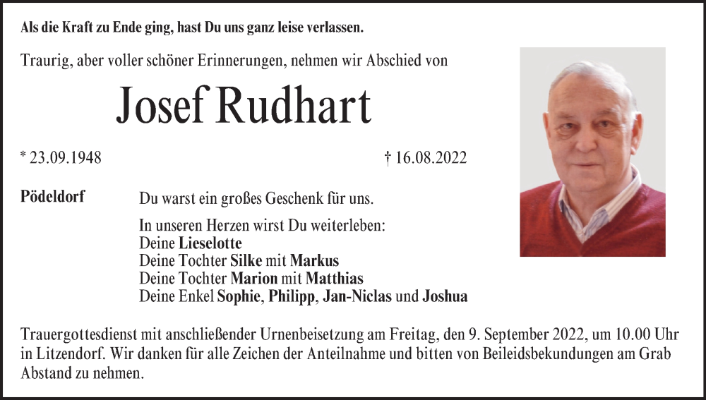 Hier finden Sie alle Traueranzeigen aus der Zeitung, die bisher für Josef Rudhart erschienen sind. Weitere Traueranzeigen, die in der Zeitung erscheinen, werden hier ebenfalls aufgelistet