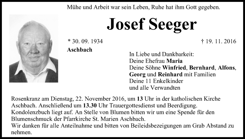 Hier finden Sie alle Traueranzeigen aus der Zeitung, die bisher für Josef Seeger erschienen sind. Weitere Traueranzeigen, die in der Zeitung erscheinen, werden hier ebenfalls aufgelistet