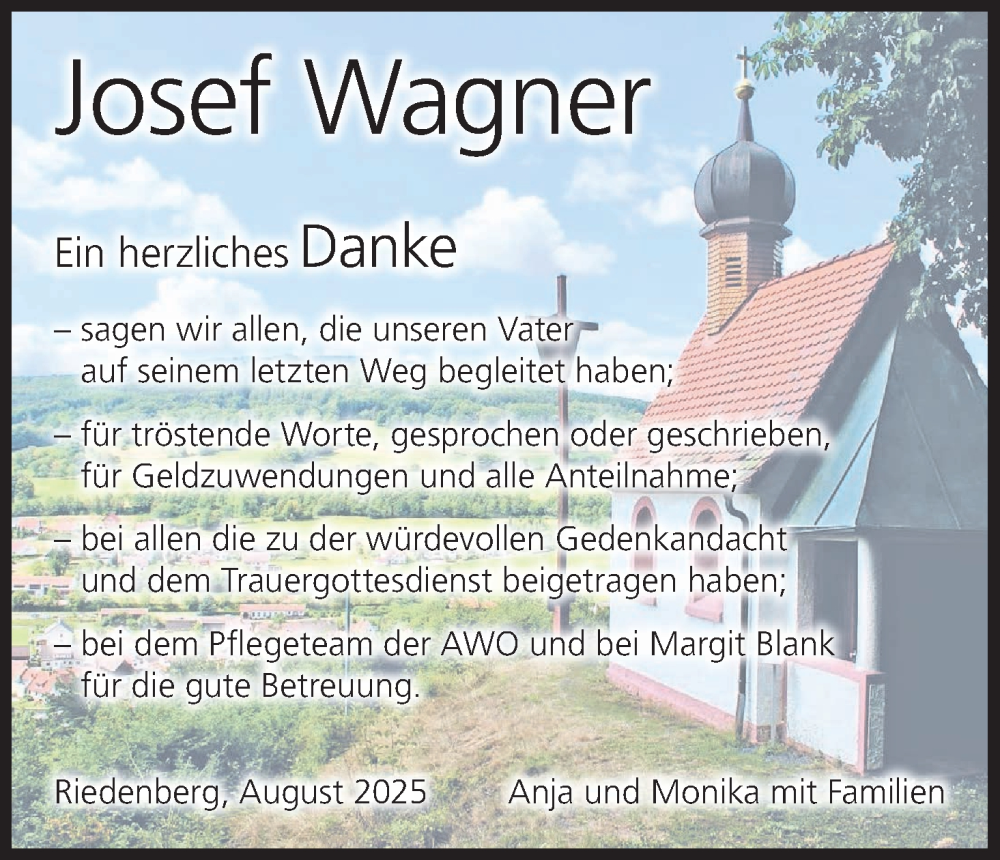 Hier finden Sie alle Traueranzeigen aus der Zeitung, die bisher für Josef Wagner erschienen sind. Weitere Traueranzeigen, die in der Zeitung erscheinen, werden hier ebenfalls aufgelistet