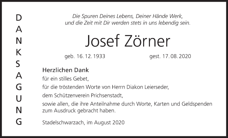 Hier finden Sie alle Traueranzeigen aus der Zeitung, die bisher für Josef Zörner erschienen sind. Weitere Traueranzeigen, die in der Zeitung erscheinen, werden hier ebenfalls aufgelistet