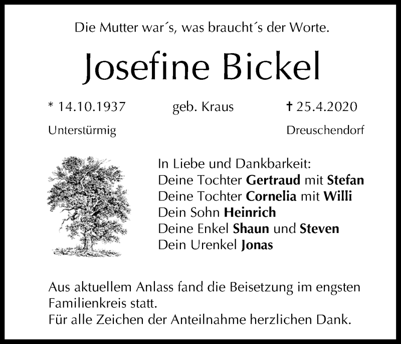 Hier finden Sie alle Traueranzeigen aus der Zeitung, die bisher für Josefine Bickel erschienen sind. Weitere Traueranzeigen, die in der Zeitung erscheinen, werden hier ebenfalls aufgelistet