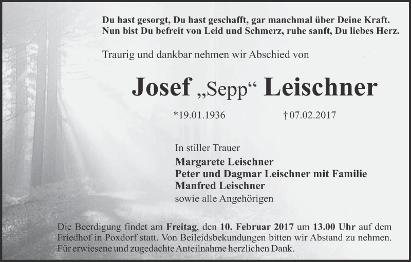 Hier finden Sie alle Traueranzeigen aus der Zeitung, die bisher für Josef Sepp Leischner erschienen sind. Weitere Traueranzeigen, die in der Zeitung erscheinen, werden hier ebenfalls aufgelistet