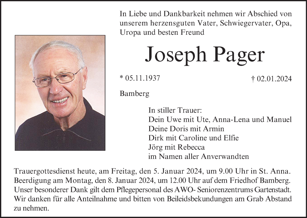 Hier finden Sie alle Traueranzeigen aus der Zeitung, die bisher für Joseph Pager erschienen sind. Weitere Traueranzeigen, die in der Zeitung erscheinen, werden hier ebenfalls aufgelistet