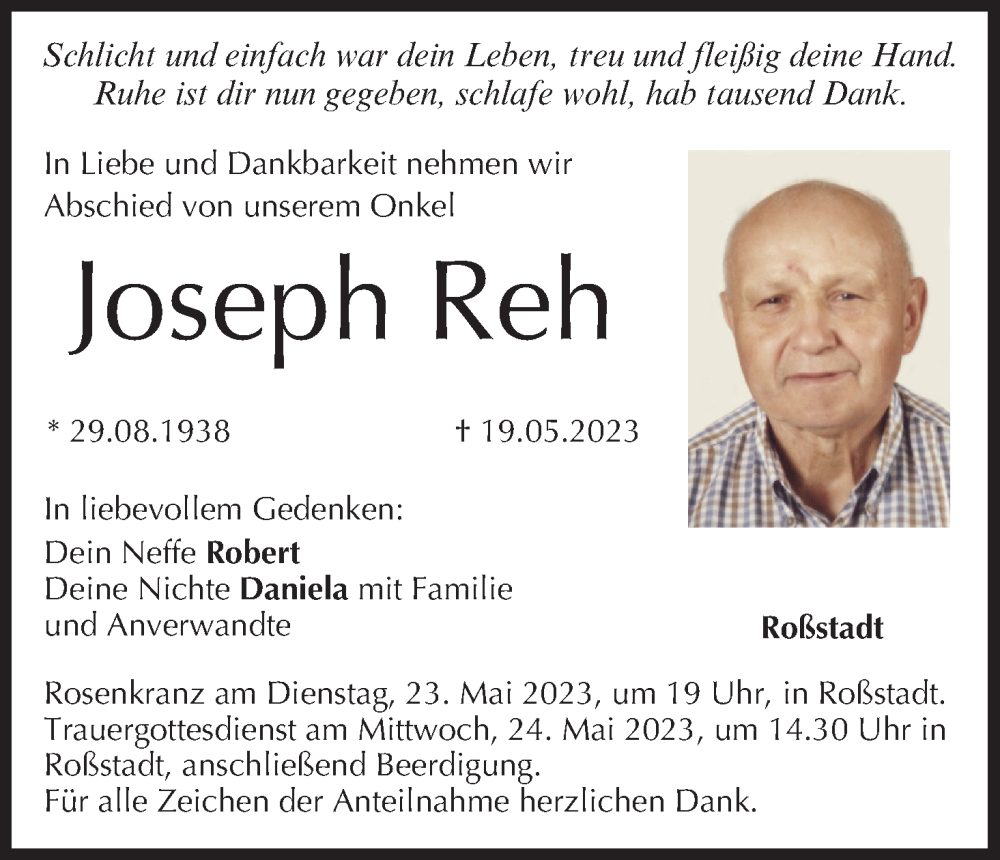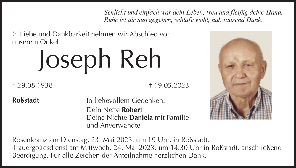 Hier finden Sie alle Traueranzeigen aus der Zeitung, die bisher für Joseph Reh erschienen sind. Weitere Traueranzeigen, die in der Zeitung erscheinen, werden hier ebenfalls aufgelistet