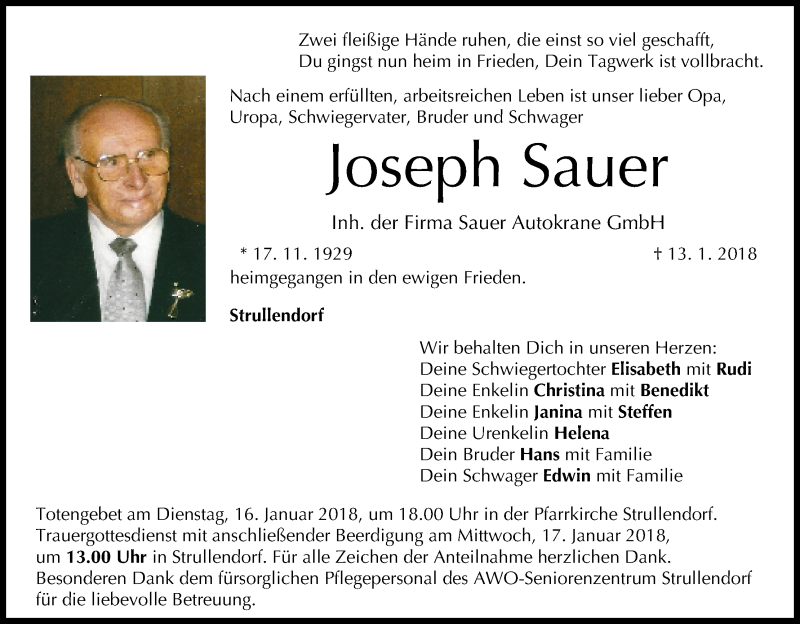 Hier finden Sie alle Traueranzeigen aus der Zeitung, die bisher für Joseph Sauer erschienen sind. Weitere Traueranzeigen, die in der Zeitung erscheinen, werden hier ebenfalls aufgelistet