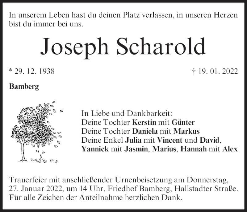 Hier finden Sie alle Traueranzeigen aus der Zeitung, die bisher für Joseph Scharold erschienen sind. Weitere Traueranzeigen, die in der Zeitung erscheinen, werden hier ebenfalls aufgelistet