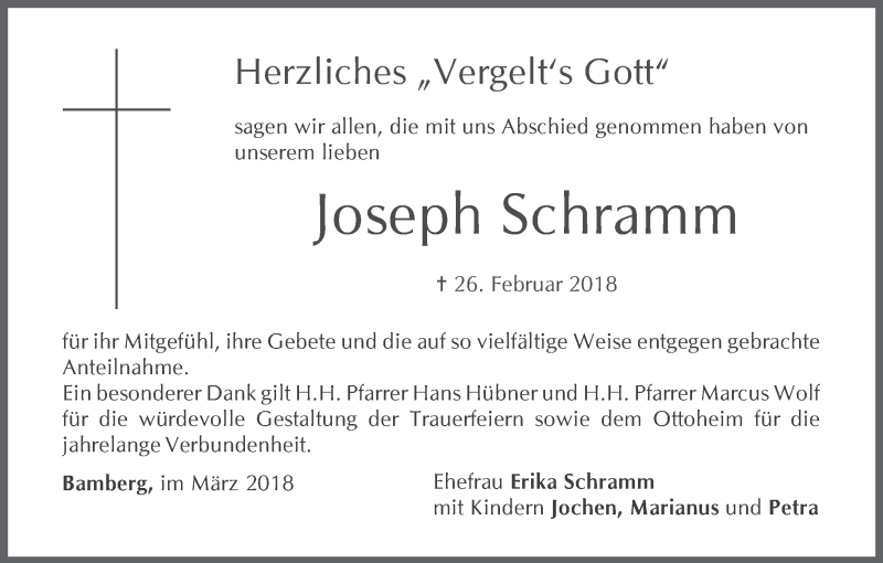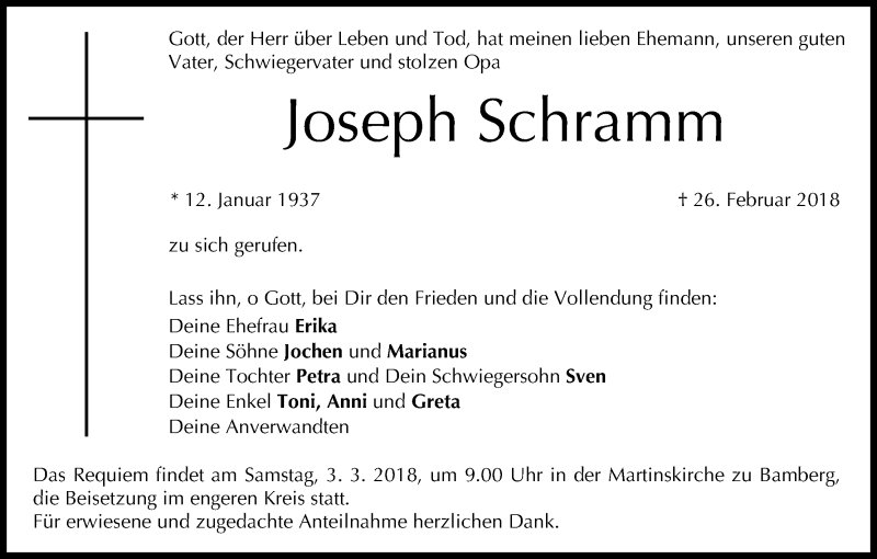 Hier finden Sie alle Traueranzeigen aus der Zeitung, die bisher für Joseph Schramm erschienen sind. Weitere Traueranzeigen, die in der Zeitung erscheinen, werden hier ebenfalls aufgelistet