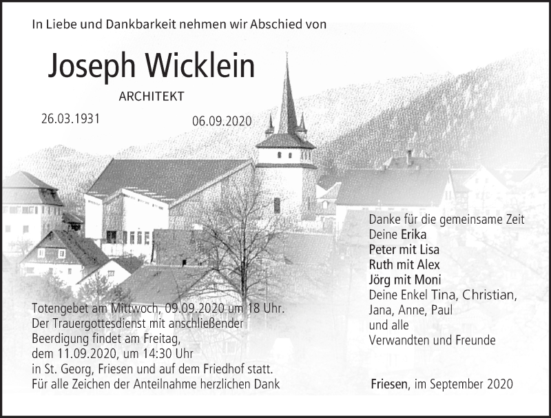 Hier finden Sie alle Traueranzeigen aus der Zeitung, die bisher für Joseph Wicklein erschienen sind. Weitere Traueranzeigen, die in der Zeitung erscheinen, werden hier ebenfalls aufgelistet