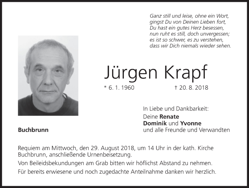 Hier finden Sie alle Traueranzeigen aus der Zeitung, die bisher für Jürgen Krapf erschienen sind. Weitere Traueranzeigen, die in der Zeitung erscheinen, werden hier ebenfalls aufgelistet