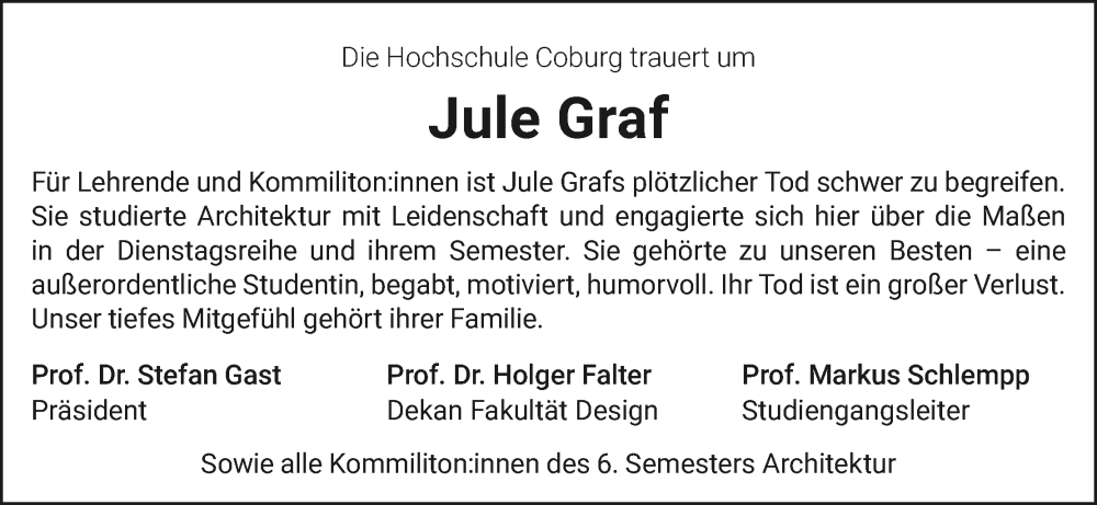 Hier finden Sie alle Traueranzeigen aus der Zeitung, die bisher für Jule Graf erschienen sind. Weitere Traueranzeigen, die in der Zeitung erscheinen, werden hier ebenfalls aufgelistet