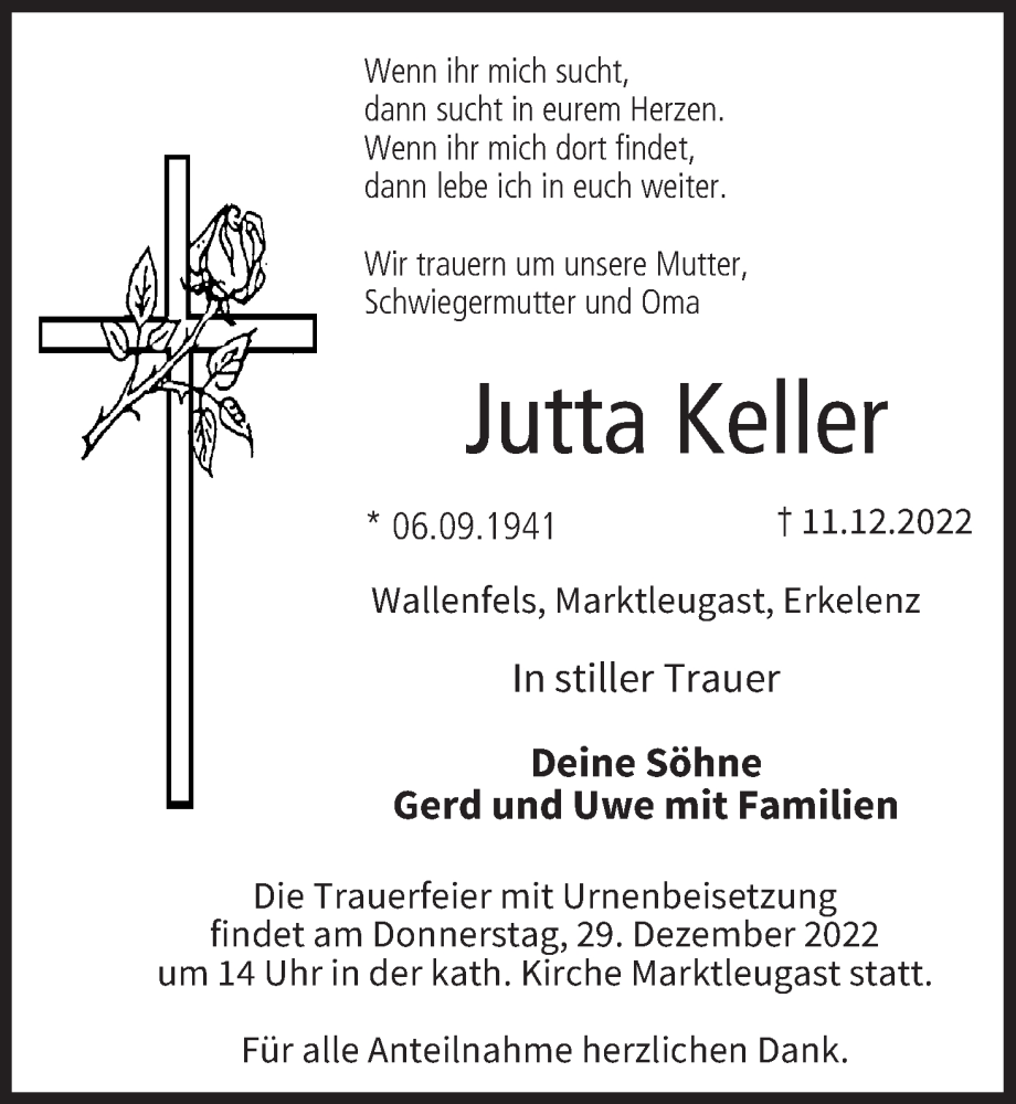 Hier finden Sie alle Traueranzeigen aus der Zeitung, die bisher für Jutta Keller erschienen sind. Weitere Traueranzeigen, die in der Zeitung erscheinen, werden hier ebenfalls aufgelistet