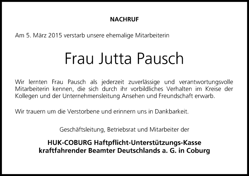 Hier finden Sie alle Traueranzeigen aus der Zeitung, die bisher für Jutta Pausch erschienen sind. Weitere Traueranzeigen, die in der Zeitung erscheinen, werden hier ebenfalls aufgelistet