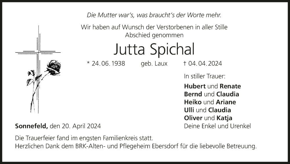 Hier finden Sie alle Traueranzeigen aus der Zeitung, die bisher für Jutta Spichal erschienen sind. Weitere Traueranzeigen, die in der Zeitung erscheinen, werden hier ebenfalls aufgelistet