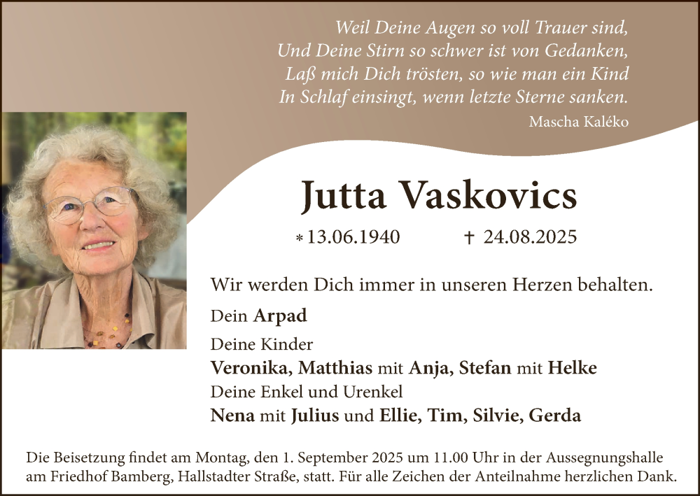 Hier finden Sie alle Traueranzeigen aus der Zeitung, die bisher für Jutta Vaskovics erschienen sind. Weitere Traueranzeigen, die in der Zeitung erscheinen, werden hier ebenfalls aufgelistet