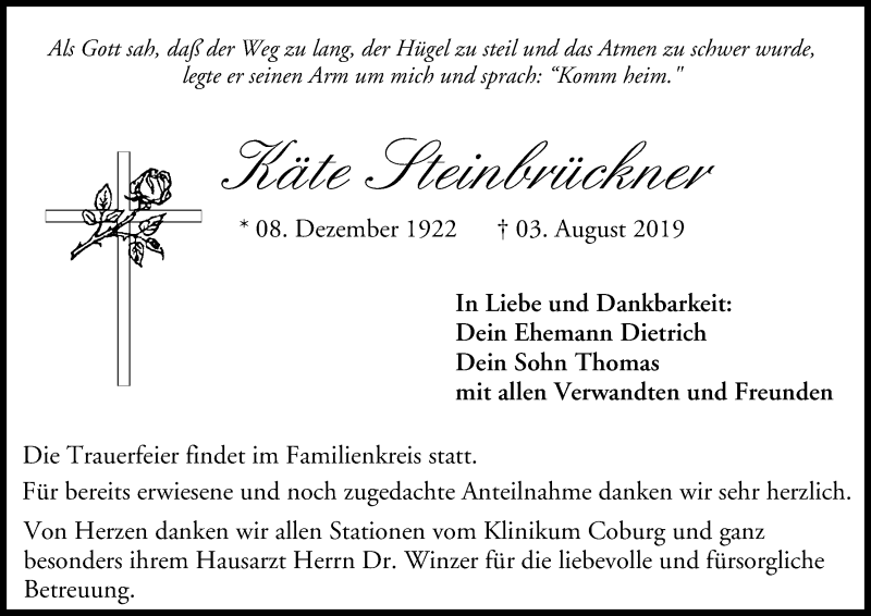 Hier finden Sie alle Traueranzeigen aus der Zeitung, die bisher für Käte Steinbrückner erschienen sind. Weitere Traueranzeigen, die in der Zeitung erscheinen, werden hier ebenfalls aufgelistet