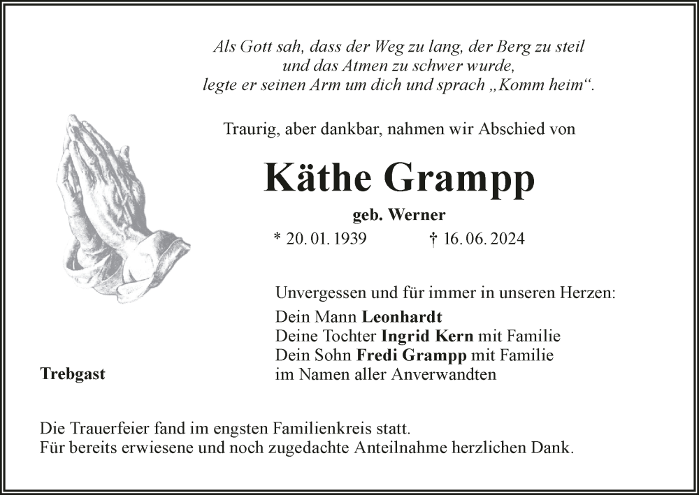 Hier finden Sie alle Traueranzeigen aus der Zeitung, die bisher für Käthe Grampp erschienen sind. Weitere Traueranzeigen, die in der Zeitung erscheinen, werden hier ebenfalls aufgelistet
