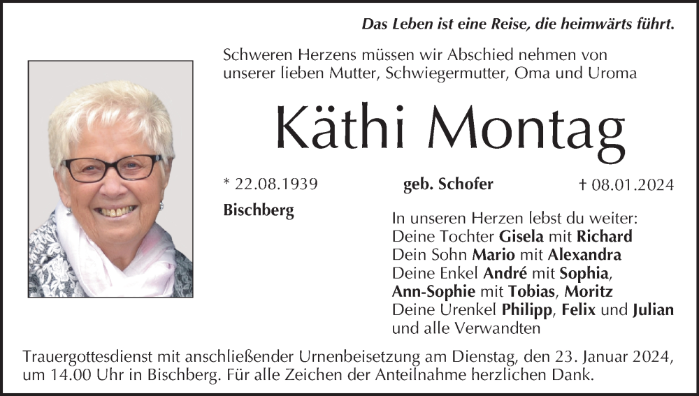Hier finden Sie alle Traueranzeigen aus der Zeitung, die bisher für Käthi Montag erschienen sind. Weitere Traueranzeigen, die in der Zeitung erscheinen, werden hier ebenfalls aufgelistet