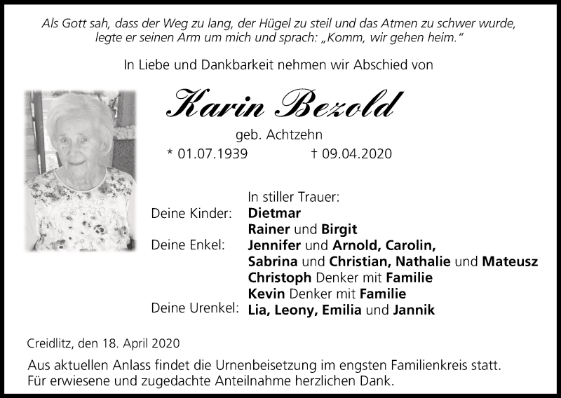 Hier finden Sie alle Traueranzeigen aus der Zeitung, die bisher für Karin Bezold erschienen sind. Weitere Traueranzeigen, die in der Zeitung erscheinen, werden hier ebenfalls aufgelistet
