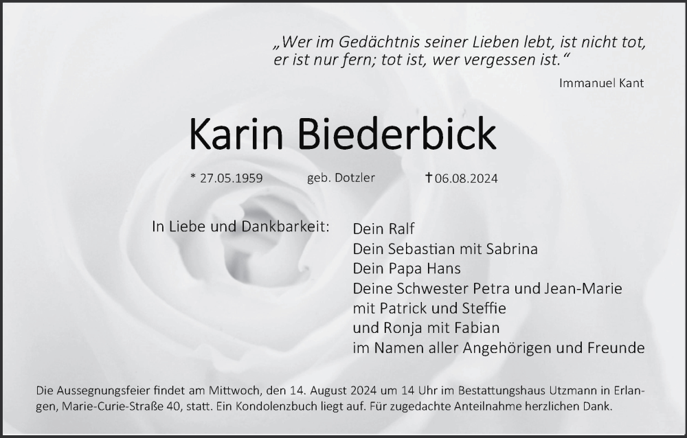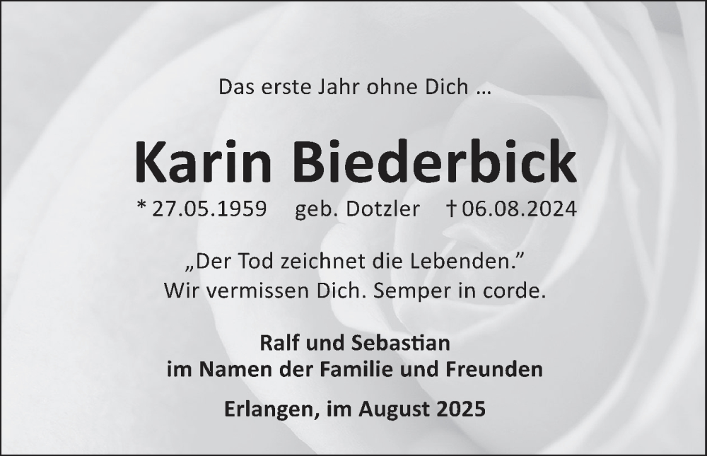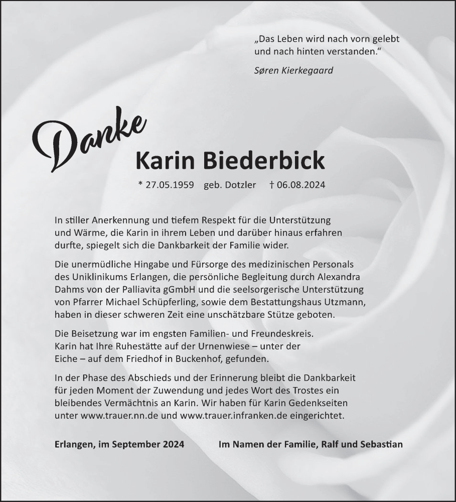 Hier finden Sie alle Traueranzeigen aus der Zeitung, die bisher für Karin Biederbick erschienen sind. Weitere Traueranzeigen, die in der Zeitung erscheinen, werden hier ebenfalls aufgelistet