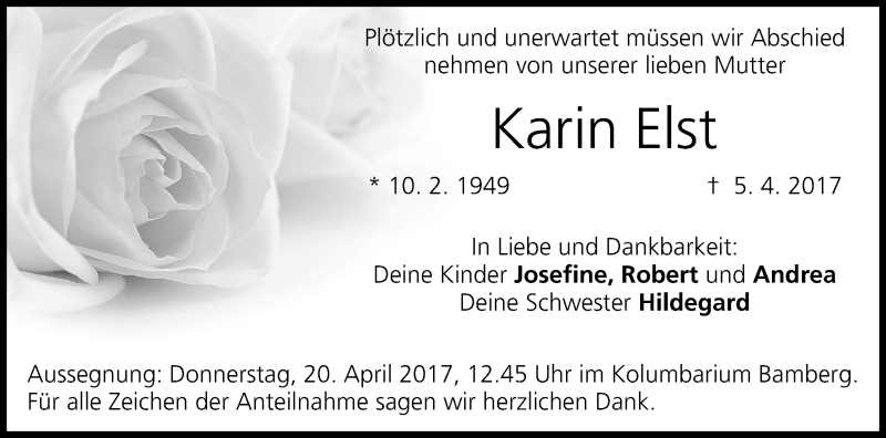 Hier finden Sie alle Traueranzeigen aus der Zeitung, die bisher für Karin Elst erschienen sind. Weitere Traueranzeigen, die in der Zeitung erscheinen, werden hier ebenfalls aufgelistet