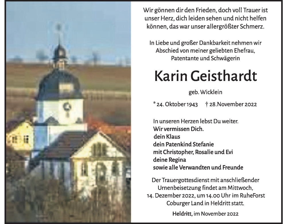 Hier finden Sie alle Traueranzeigen aus der Zeitung, die bisher für Karin Geisthardt erschienen sind. Weitere Traueranzeigen, die in der Zeitung erscheinen, werden hier ebenfalls aufgelistet