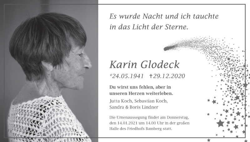 Hier finden Sie alle Traueranzeigen aus der Zeitung, die bisher für Karin Glodeck erschienen sind. Weitere Traueranzeigen, die in der Zeitung erscheinen, werden hier ebenfalls aufgelistet