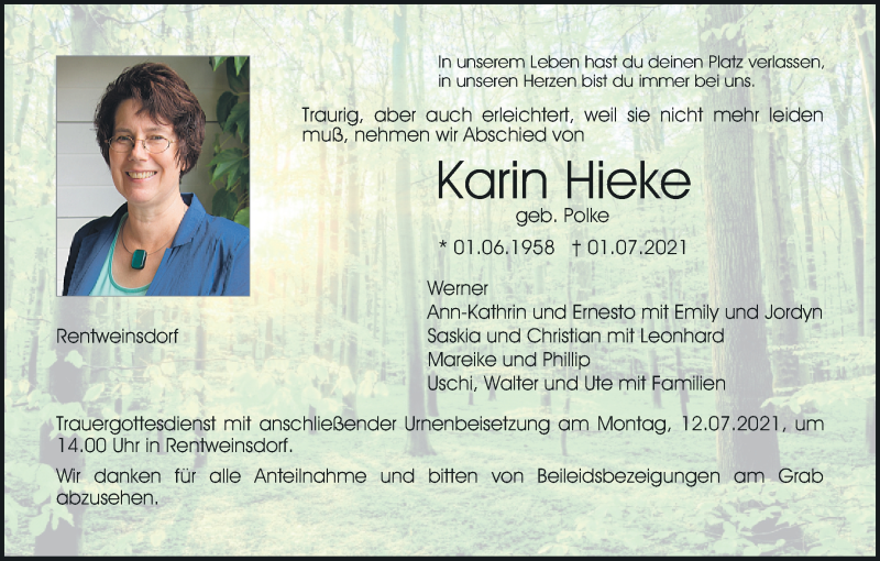 Hier finden Sie alle Traueranzeigen aus der Zeitung, die bisher für Karin Hieke erschienen sind. Weitere Traueranzeigen, die in der Zeitung erscheinen, werden hier ebenfalls aufgelistet