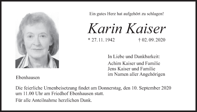 Hier finden Sie alle Traueranzeigen aus der Zeitung, die bisher für Karin Kaiser erschienen sind. Weitere Traueranzeigen, die in der Zeitung erscheinen, werden hier ebenfalls aufgelistet