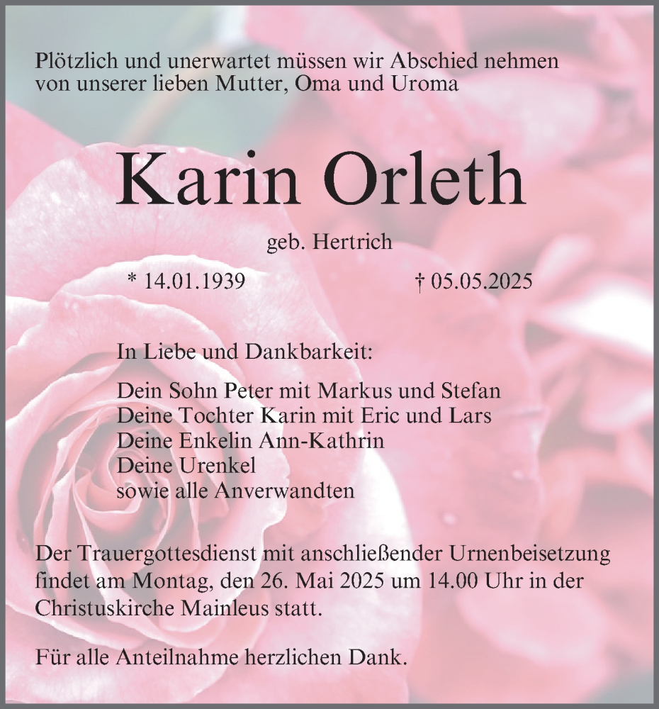 Hier finden Sie alle Traueranzeigen aus der Zeitung, die bisher für Karin Orleth erschienen sind. Weitere Traueranzeigen, die in der Zeitung erscheinen, werden hier ebenfalls aufgelistet