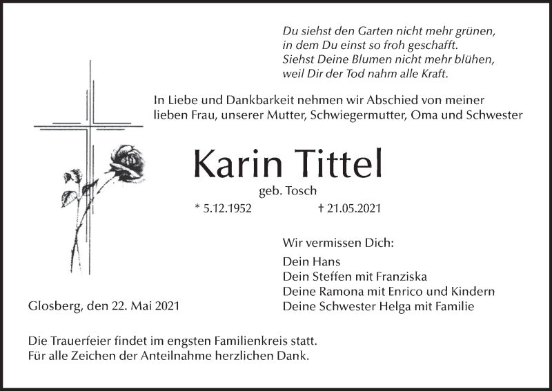 Hier finden Sie alle Traueranzeigen aus der Zeitung, die bisher für Karin Tittel erschienen sind. Weitere Traueranzeigen, die in der Zeitung erscheinen, werden hier ebenfalls aufgelistet
