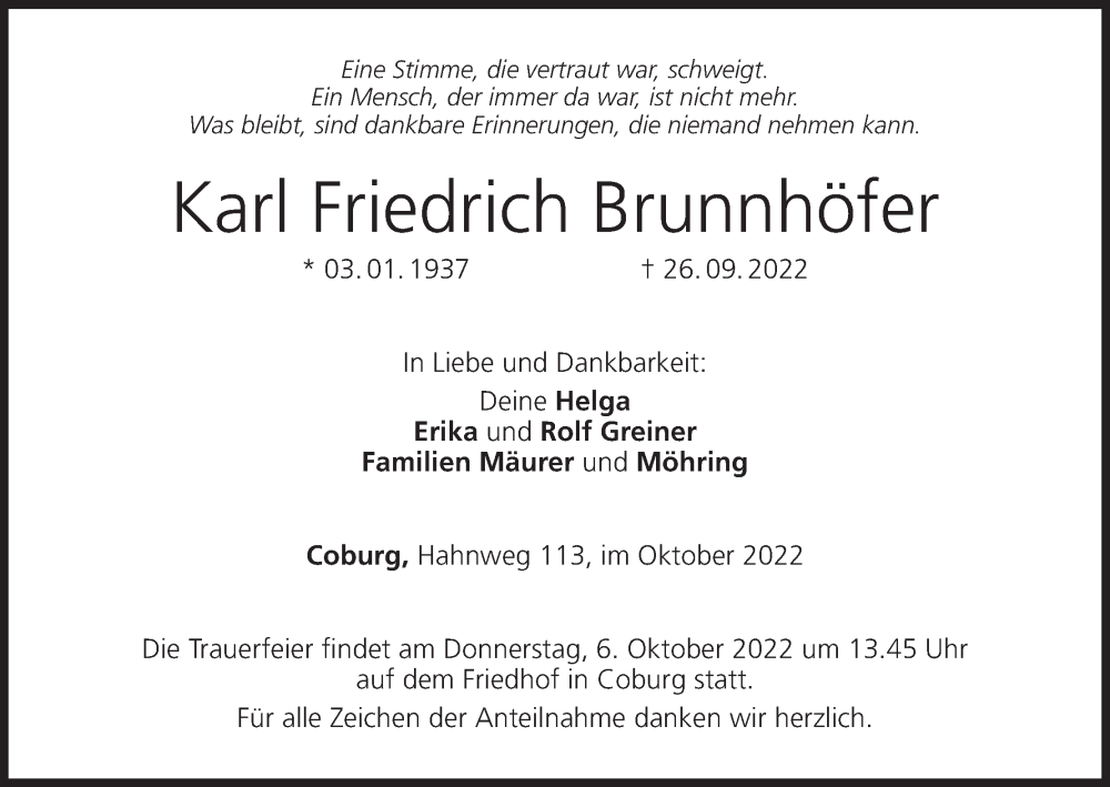 Hier finden Sie alle Traueranzeigen aus der Zeitung, die bisher für Karl Friedrich Brunnhöfer erschienen sind. Weitere Traueranzeigen, die in der Zeitung erscheinen, werden hier ebenfalls aufgelistet