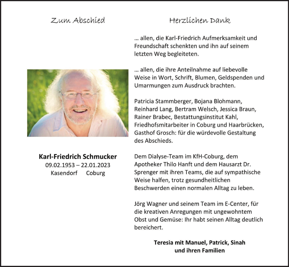 Hier finden Sie alle Traueranzeigen aus der Zeitung, die bisher für Karl-Friedrich Schmucker erschienen sind. Weitere Traueranzeigen, die in der Zeitung erscheinen, werden hier ebenfalls aufgelistet